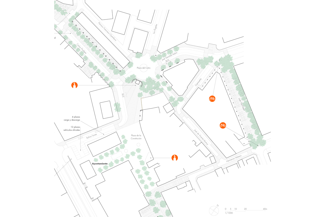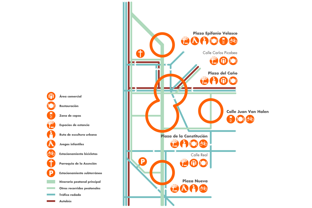 Para completar con éxito la peatonalización de un área tan amplia, se propone un desarrollo a base de nodos urbanos y recorridos preferenciales: la potenciación de ciertos espacios como focos de atracción, su caracterización e individualización como lugar, y el establecimiento de rutas peatonales entre ellos, constituyéndose estas también en recorridos comerciales. Las calles Real y Carlos Picabea potencian su función ya patente de senda urbana, mientras que las plazas de la Constitución y del Caño conforman un espacio a la vez único y múltiple, corazón del sistema urbano. En su periferia, las plazas Nueva y de Epifanio Velasco y la calle Juan Van-Halen constituyen los polos que propician el paseo y disfrute de las nuevas áreas recuperadas para los torresanos.